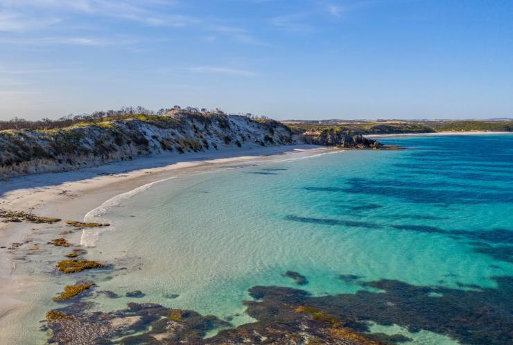 澳大利亚的袋鼠岛(Kangaroo Island)被风景如画的海滩所包围,而其中最美的当属微风湾海滩(Vivonne Bay Beach)。这个海滩周围没有很多点缀,但正是这份纯粹让它与众不同。想象一下,一片洁白无暇的沙滩,清澈见底的海水,顽皮的海豹和海豚恣意嬉戏,微风湾保育公园(Vivonne Bay Conservation Park)内,数公里长的灌木丛林在微风中轻轻摇曳,这是多么美妙的场景。
